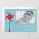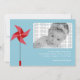 This adorable blue baby announcement features a red pinwheel. © Mood 4 Cute