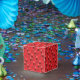 This party favour box features a pixelated pattern of squares in shades of red. The pattern resembles 16 bit images used in many popular video and computer games.
