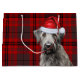 This festive Christmas gift bag features a charming Irish Wolfhound dog dressed for the holidays. The dog is sporting a red Santa hat against a background of a cheerful black and red plaid pattern, adding to the holiday spirit. The bag has white handles, making it easy to carry and perfect for gifting. This unique and adorable design is sure to bring smiles to everyone who sees it.