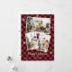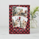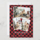 Custom red buffalo plaid photo collage Merry Christmas cards featuring three photos with snowflakes and stars on a red and black buffalo plaid background.