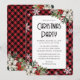 Elegant red buffalo plaid Christmas party invitation featuring white poinsettia, holly, red berries and snowflakes.