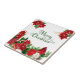 This elegant Holiday ceramic tile features a bottom border of red poinsettia, holly, greenery, and gold embellishment. At one end is a red cardinal perched upon a white poinsettia blossom. Each of the top corners has a smaller red poinsettia bouquet, and "Merry Christmas" is in green stylised text at the centre. Everything is placed on a white background. Pretty for any Holiday table, or as a festive seasonal gift.
