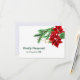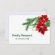 This RSVP card features a festive and pretty Holiday image of bright red poinsettia flowers nestled among green lives and a pine bough. A bit of gold embellishment adds some sparkle to the arrangement. The images and text are placed on a white background. The back of the invitation has more custom text fields. Perfect for a Christmas season wedding! Be sure to see the matching wedding invitations in our store.