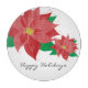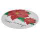 This round decorative glass cutting board features a graphic of two red poinsettias and the customisable text: Happy Holidays.