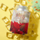 Can cooler with a festive holiday photograph featuring a bouquet of red poinsettias along the bottom. Shimmering golden bokeh lights in the background. Merry Christmas typography written in a trendy red font.