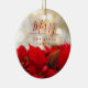 A christmas ornament with a festive holiday photograph featuring a bouquet of red poinsettias along the bottom. Shimmering golden bokeh lights in the background.