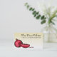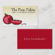 Sketchy red pomegranate business cards for personal or private chefs, bakers and other cooking or baking business. Round raspberry whole and sliced red poms with seeds on a rough linen pattern background.