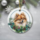 On the front of this Holiday ornament is a beautiful portrait of an adorable red Pomeranian dog peeking out of a holly and evergreen bough. Red berries and pine cones decorate the holly and pine sprigs. The image is placed on a white circle within a thin blue green circle border frame. The back of the ornament has the same evergreen bough wreath and circle with your custom text in red. Pretty!