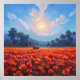 A large field of red poppies with a blazing sun. Bathed in golden light. Featuring a quaint building and truck in the landscape, this artwork is a celebration of natural beauty and peaceful moments. The scene features a rustic building and a classic truck nestled among rolling hills and distant trees. The bright blue sky with soft clouds adds to the feeling of peace and tranquillity. This piece is perfect for bringing a touch of natural beauty and serene light into any room. This artwork can be customised, printed, and or downloaded.
