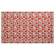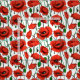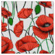 Fabric in a delicate pattern of vibrant red poppies with deep green stems and leaves, on a while background, with, each poppy bloom uniquely curved and twisted, as if swaying gently in the breeze.