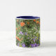 White mug with dark blue rim and handle, decorated with a photo of a colourful flowerbed.