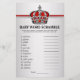 Prince baby shower games with baby word scramble on one side, and nursery rhyme quiz on the other. This red, black and silver prince crown baby shower game flyer is fun and economical! You can change the questions and the words. Hand them out to your guests telling them not to look, then start the clock. When time is up read the answers and the person with the most right wins a prize. You can even add the words and rhymes of your choice!