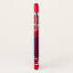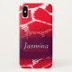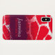 Bright animal patterned iphone case in bold red, white and purple hues. Personalise this item with your full name. This example currently reads: Jasmina Henderson. Original pattern design by Sarah Trett, is based on the patterning found on a giraffe with a halftone moire dot gain pattern overlay.