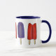 Ceramic mug features an original marker illustration of a row of red and purple popsicles. A classic summer time treat!