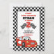 Child's race car 2nd birthday party invitation with a bright red car and two black and white chequered flags on a black and white chequered background Text says, "Start your engines" and includes the birthday child's name, date, location of the party and rsvp information. This card is designed for a two-year-old's birthday party, but you can easily change the number and design your card for a child of any age. Contact me for assistance with your customisations or to request additional matching or coordinating Zazzle products for your party.