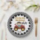 Kids who love racing and race cars will love this 7th birthday racing theme paper plate design featuring a red racing car with the number 6 on the door, a driver with helmet and goggles, chequered flags, yellow text that reads It's My 6th Birthday, and a border with a black decorative ring and black and white checks. You can easily personalise these racing theme sixth birthday paper plates with a name before ordering.