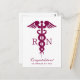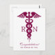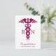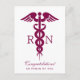 Congratulations postcard for a nursing school graduate with a stylish red cadaceus symbol with the letters R N on either side. Simple minimalist design.