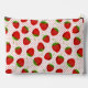 Pouch in a scattered pattern of red ripe strawberries on a red and white pin dot background