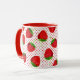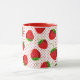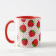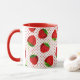 Coffee mug in a scattered pattern of red ripe strawberries on a red and white pin dot background