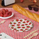Paper plates in a scattered pattern of red ripe strawberries on a red and white pin dot background