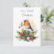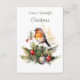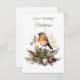 Celebrate the festive season with this winter scene: watercolor illustration of red- breasted robin perched on a branch of pine.