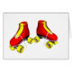A pair of red roller skates with yellow laces. You can change the background colour or add text during checkout.