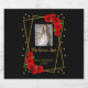 Gold and black Quinceañera with vibrant traditional red roses and classic script typography. Photo template via Pixabay licensed under CC0 and must be replaced with your own photo