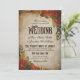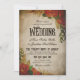 A vintage wedding invitation with red roses, eucalyptus, and fern, with vintage fonts and a distressed look. Suitable for themed weddings, such as vintage, old West, rustic romance, and more.