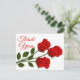 Say thank you with red roses! This sweet and simple floral post card features hand drawn red roses with long thorny stems highlighting a red thank you in a fancy script font highlighted against a crisp white background.