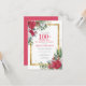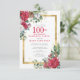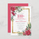 Beautiful red and white roses are nestled in holly and eucalyptus leaves to create an elegant floral display. They decorate a wide gold frame and are dappled with gold confetti dust. 100th birthday surprise party and the person's name are written in a large red text. All of the text can be edited. Perfect choice for a special winter birthday celebration.