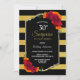 Black and gold striped surprise 30th birthday dinner party invitation featuring elegant red and orange floral displays. Text is fully customisable to enable you to include all of your own information for your birthday celebration. (NB: Faux glitter has been featured on this invitation.)
