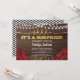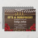 Elegant red rose and gold surprise party invitation with string light design on rustic wood background. Classy, feminine and glamourous.
