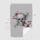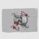 This sports towel has a pencil sketch of a skull with swirls coming out of it and red rose vines trailing around it.