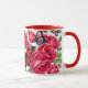 An red accented mug with a white background with red roses and butterflies.