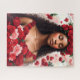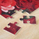 This floral puzzle features oil painting portrait artwork of a beautiful brown-skinned woman with long, curly hair adorned by and surrounded by red roses. The melanated beauty's eyes are closed in a serene expression.