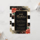Elegant black and white striped floral 50th birthday invitation featuring a gold frame decorated by gold confetti, red roses and greenery.