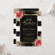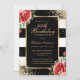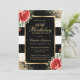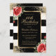 Elegant black and white striped floral 60th birthday invitation featuring a gold frame decorated by gold confetti, red roses and greenery.