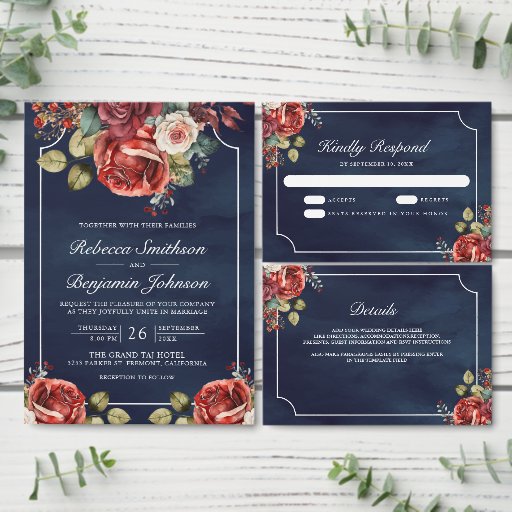 Red Roses Floral Photo QR Code Navy Blue Wedding Save The Date