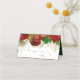This pretty table place card features a pretty red rose bouquet with green leaves and gold embellishment. Your custom text is in dark green at the lower centre. The back of the card has two more custom text fields in matching green and gold, and a matching bottom corner floral image. The images and text are placed on a white background. The inside of the card is dark green. Be sure to see the matching products, including invitations, in our store.