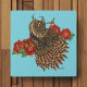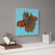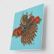 A beautiful brown owl with red roses and butterflies in a backdrop of blue