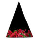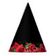 This party hat is shown with Red rose garland with Green butterflies along the bottom edges of this Black party hat.