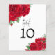 Red Roses Script Wedding Table Number. A size 4.5 x 5.6” semi-gloss 110lbs weight, which is of similar thickness to a postcard, with ONE per sheet. A flourish of rich red roses decorate the top left and bottom right corners and your table number is in the centre. The header word Table is in an elegant set typography in black, and the table number can be easily personalised.