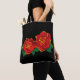 Two red roses in a backdrop of black all drawn in a traditional tattoo style.