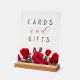 Wedding reception cards and gifts sign with red roses border. Clear acrylic standing sign with black printed text and red "and" wording in script. Realistic red roses and buds make a beautiful border along the bottom. Shown with the wood stand, which is optional. This design transfers to other sizes as well.