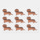 Destei's original cartoon illustration of an adorable long hair red sable coat colour Dachshund breed dog. The dog design is placed nine times on each sheet. The background has a pattern of grey dog paw prints.