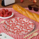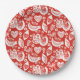NewParkLane - Christmas Paper Plates, with a traditional, intricate Scandinavian Christmas Pattern of flowers, hearts, birds, and Christmas ornaments in red and white.