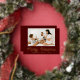 Simple Script Calligraphy Family Photo Christmas Foil Holiday Card in dark red background, gold foil script calligraphy lettering and an editable message at the back. (Photo credits to Jonathan Borba of Unsplash. Kindly replace it with your own. )