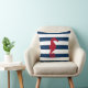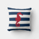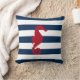 This is a great pillow that features a red sea horse on a navy blue and white stripes pattern.