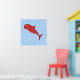 A red shark cartoon on blue stripes. A fun animal cartoon design.