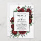 Design features watercolor peony and rose floral elements in shades of red and burgundy over eucalyptus botanical greenery. Template also features a printed silver or grey coloured box for an added elegant layout. The typography displays a modern layout with black text. View the collection link on this page to find matching products within the wedding set.